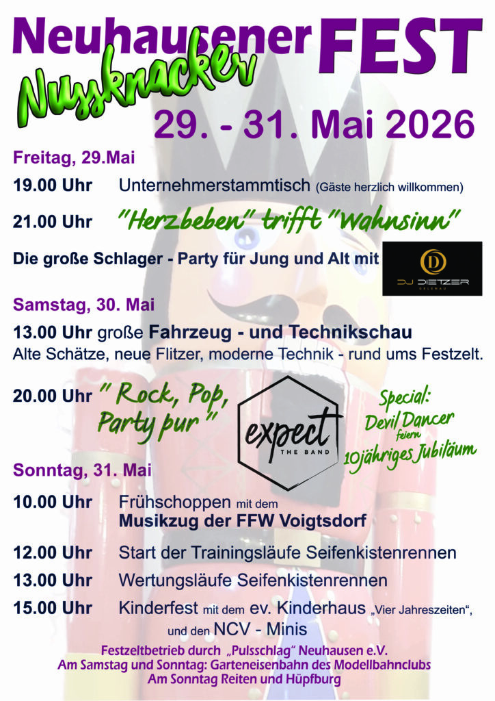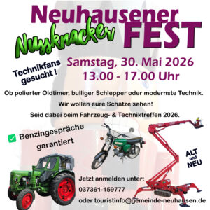 Termin Nussknackerfest 2026: 29.-31. Mai 2026 Wer sich noch zum Fahrzeug- und Techniktreffen anmelden möchte, bitte mit der Touristinfo Neuhausen in Verbindung setzen. touristinfo@gemeinde-neuhausen.de Programm 2026 HIER: